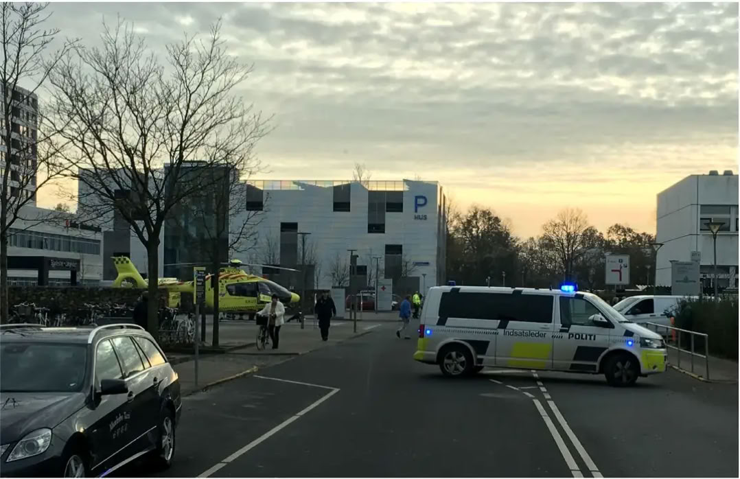 Der Rettungshubschrauber (HEMS) aus Billund. Hier bringt er einen Patienten zur Uniklinik in Odense zum Landeplatz, wo der Patient in einem RTW umgelagert werden muss und zu Aufnahme gefahren wird.