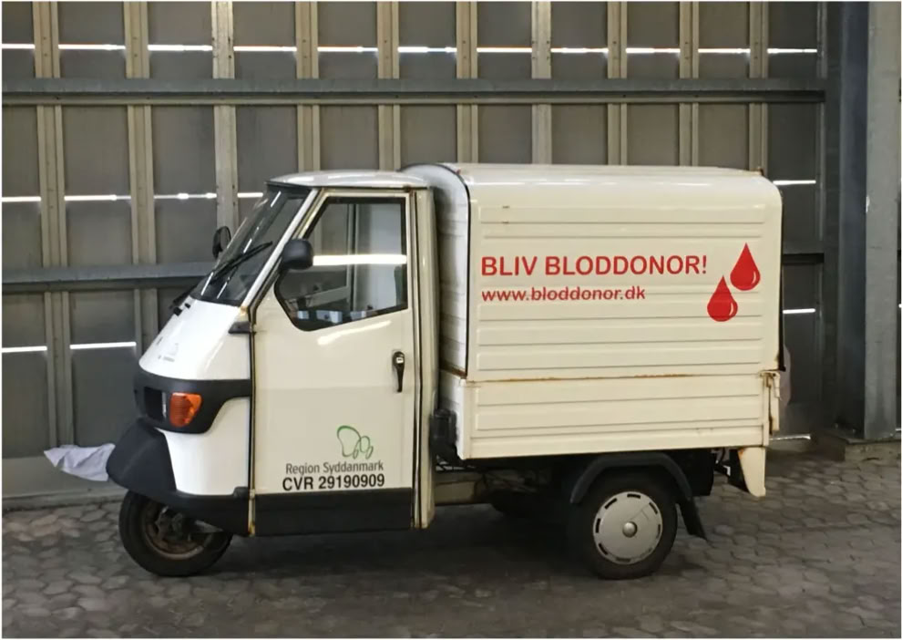 In der Liegendzufahrt der Klinik in Esbjerg steht dieser kurioser Blutransporter.