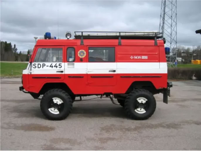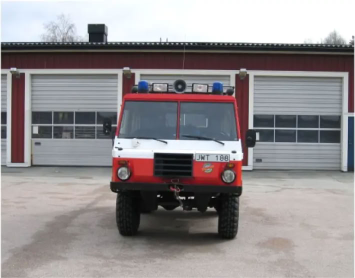 Dieses Fahrzeug stand vor dem Feuerwehrhaus Färgelanda (Dalsland, Schweden), kam aber von einer anderen unbekannten Wehr. Was schräg im hinteren Fenster schimmert ist eine Schleifkorbtrage.