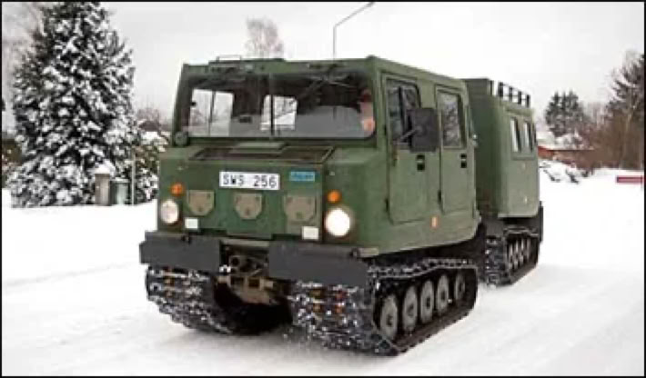 Das schwedische Militär setzt im Winter solche schneetauglichen Fahrzeuge ein, um die Energiefirmen bei der Kontrolle der Stromleitungen eingesetzt, die noch über Land im Einsatz sind.