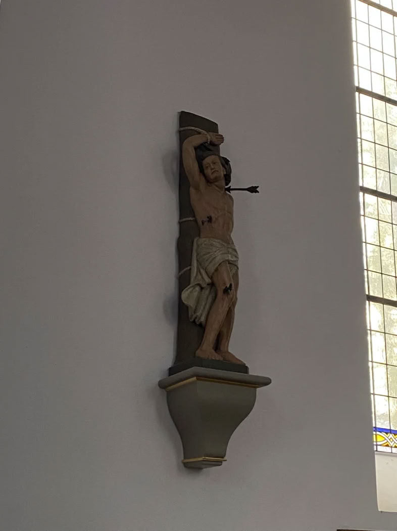 Mein erster Gedanke beim Anblick dieser Holzskulptur war: „Ach nee. Ist er doch nicht Gekreuzigt worden!“. Tatsächlich stellt es aberden heiligen Sebastian da, der im 5. Jh. durch Pfeile einen Märtyrertod starb