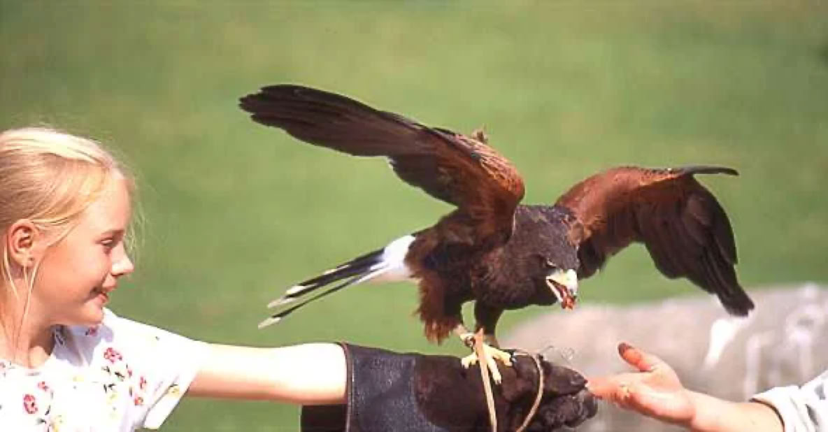 Bei der Falknershow werden auch die Zuschauer, besonders die Kinder, mit eingebunden.