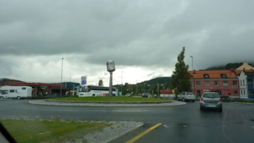 Verkehrskreisel an derE134inNotoddenmit einem überdimensionalem Mikrofon. Früher Industriestadt mit Kraftwerken und Stahlwerk, jetzt Norwegens "Hauptstadt des Blues". Alljährlich findet hier Ende Juli - Anfang August das Notodden Bluesfestivalstatt.