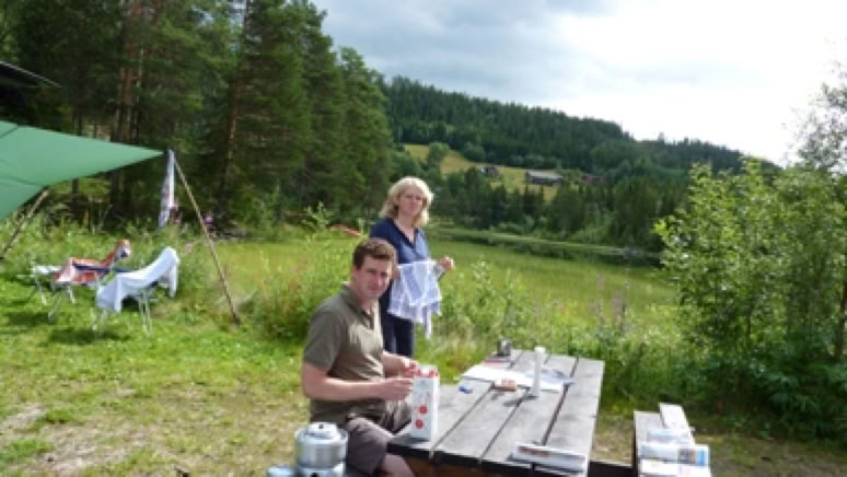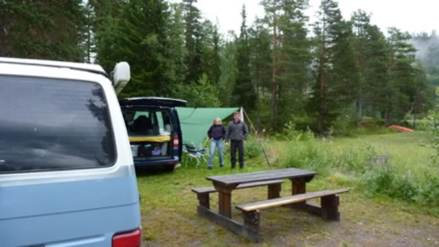 Åmotin der Telemark am Kreuzungspunkt der E 134 und RV 37 hat zwei Campingplätze. Ich fand Simon und Tanja bereits auf dem ersten Platz.