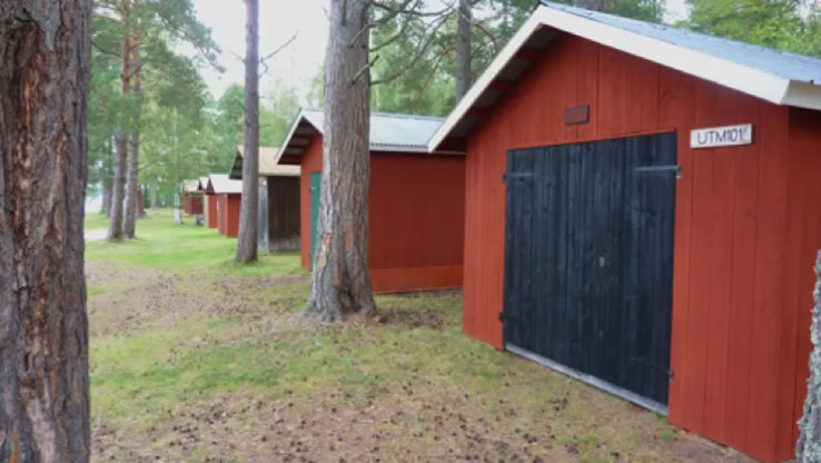 Bootshäuser im Norden der Insel. Natürlich in der hier vorrangigen FarbeFalunröd, wie überall rund um den Siljan.