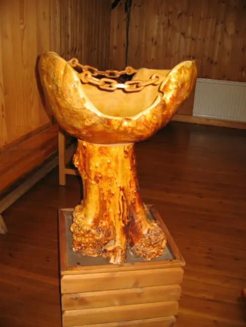 <<< Im Innern war das Taufbecken aus Holz besonders bemerkenswert.