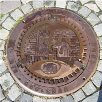 Die Kanaldeckel der Stadt zeugen von der bedeutenden Geschichte der Stadt.