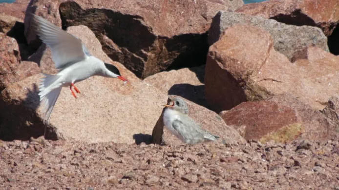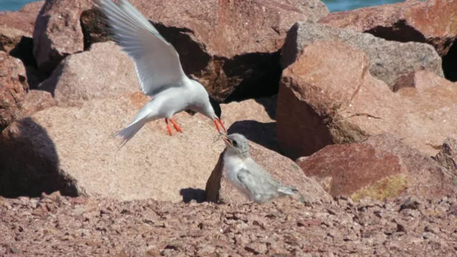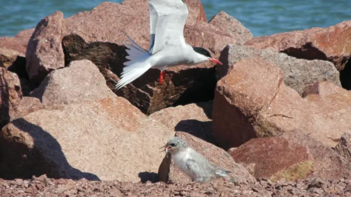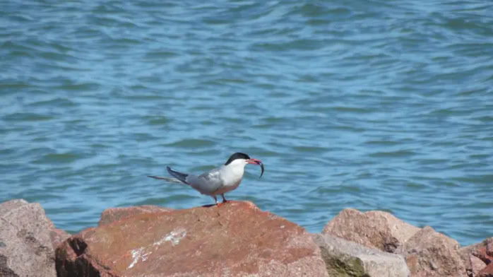 Kurz vor der Kapelle brütete einSeeschwalbenpärchenauf der Mole. Ich nahm mir eine Stund Zeit, um gute Bilder und Videos von der Fütterung des Kückens zu machen. Häufig brüten diese Vögel in Kolonien. Hier brüteten sie alleine und direkt neben dem Fußweg. Hätten die Eltern nicht versucht mich mit Scheinangriffen zu vertreiben, wäre ich nie auf die Idee gekommen nach dem Kücken, oder überhaupt irgendwelchen Kreaturen, zwischen den Steinen, zu suchen. So aber legte ich mich auf die Lauer.