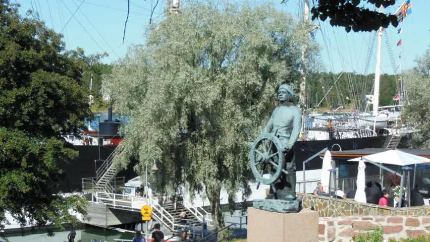 Unterhalb des Schifffahrtsmuseums steht die Statue „Der Mann am Steuer“. Die Statue wurde zu Ehren der åländischen Seefahrer, die auf dem Meer ihr Leben verloren haben, errichtet. (Quelle: www.visitaland.com)