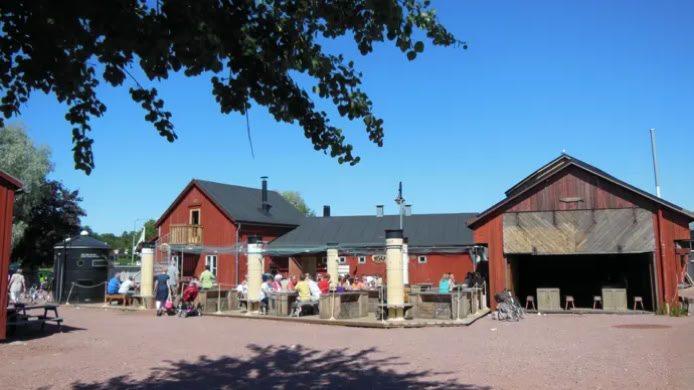 Anschließend fuhr ich zumSeefahrtsviertel (Sjöfartskvarteret)im Osthafen (Österhamn), der neben einen weiterenGästehafen(schwed.) auch noch weitere Attraktionen, wie den Badestrand "Lilla Holmen" und das Badehaus "Mariebad" (schwed.) zu bieten hat. Mich zog es aber zum historischen Teil mit seinen alten roten Hütten und Schuppen, die u.a. eine Werft, eine alte Schmiede, Räucherei mir Restaurant, sowie dasBoots- und Schiffsbaumuseumbeherbergen. Hier wurden u.a. die beiden Schiffe "Albanus" und "Linden" nachgebaut (siehe unten). Außerdem gibt es noch die Schmuckschmiede „Guldviva“ und das Handwerkshaus "Salt" (schwed.)