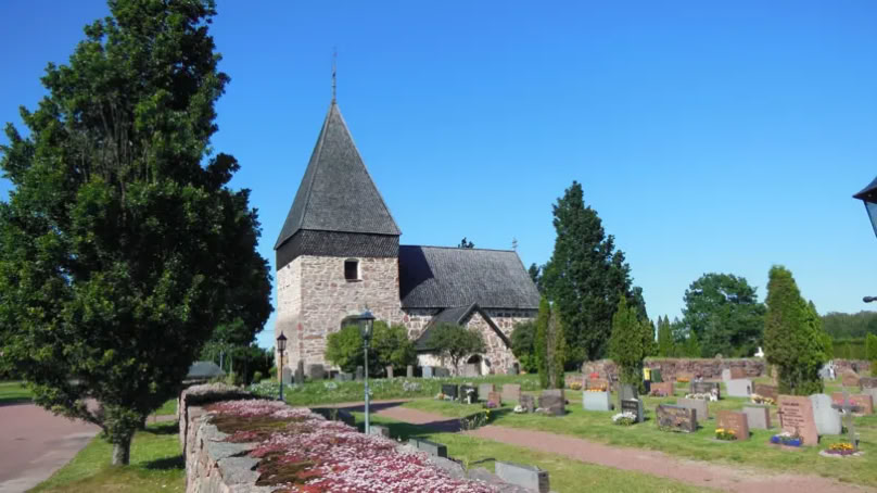 Fährt man von Storby die Straße Nr. 1 etwa drei Kilometer weiter östlich und biegt dann nach rechts Richtung Kyrkoby ab, gelangt man zum ältesten Gebäude der Insel. DieEckerö Kirche St. Lars (schwed.) aus dem 12.Jh..Im Reiseführer als festungsähnlich beschrieben, fuhr ich natürlich dorthin. Außer der Steinmauer entdeckte ich allerdings nichts, was mich an einer Festung erinnern könnte. Dennoch lohnt der Abstecher zu dieser alten Steinkirche.