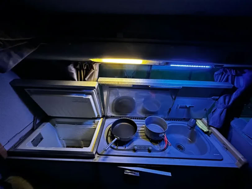 Anhängerkupplung, Standheizung, 2 Zusatzbaterien (2x 75 Amp),Fahrrad- und Dachträger, große Markise, Küche mit 2-Flammen-Herd (2,8 L/Gasflasche), großer Kühlschrank, Spüle mit heuausziehbaren Wasserhahn zum außen duschen, 50 L Frischwassertank, 20 L Schmutzwasser, drehbare Vordersitze, Außensteckdose mit Spannungswandler + 230 V Steckdose innen,