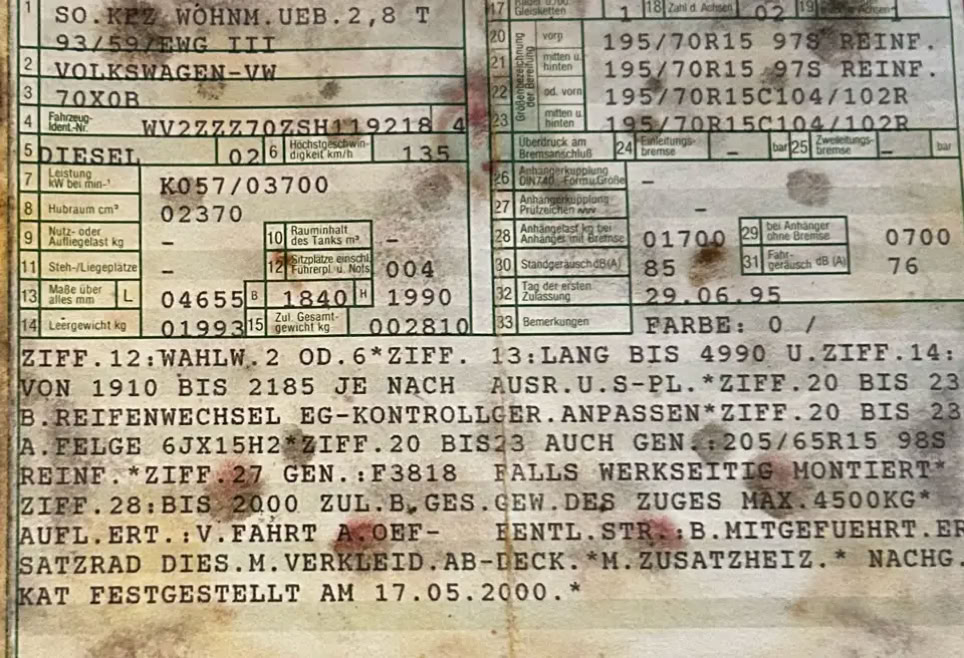 ZGG 2,810 kg = Womo-Zulassung über 2,8 T,450€ Steuer, ab Juni „H“ Kennzeichen möglich um Steuer zu reduzieren. Nach umfangreichen Schweizarbeiten HU bis 10/26, nächster Zahnriemenwechsel bei 480 TD KM, Ganzjahresreifen + 4 Sommerreifen auf Felge, Lackierung 2 Farbig Eisblau/Weiß im Stil des T1