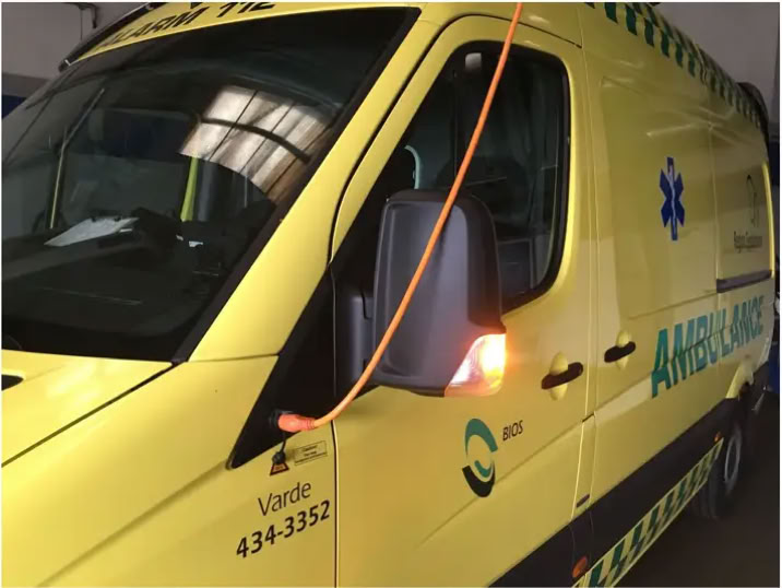 In der Liegendzufahrt der Klinik in Esbjerg steht dieser kurioser Blutransporter.
