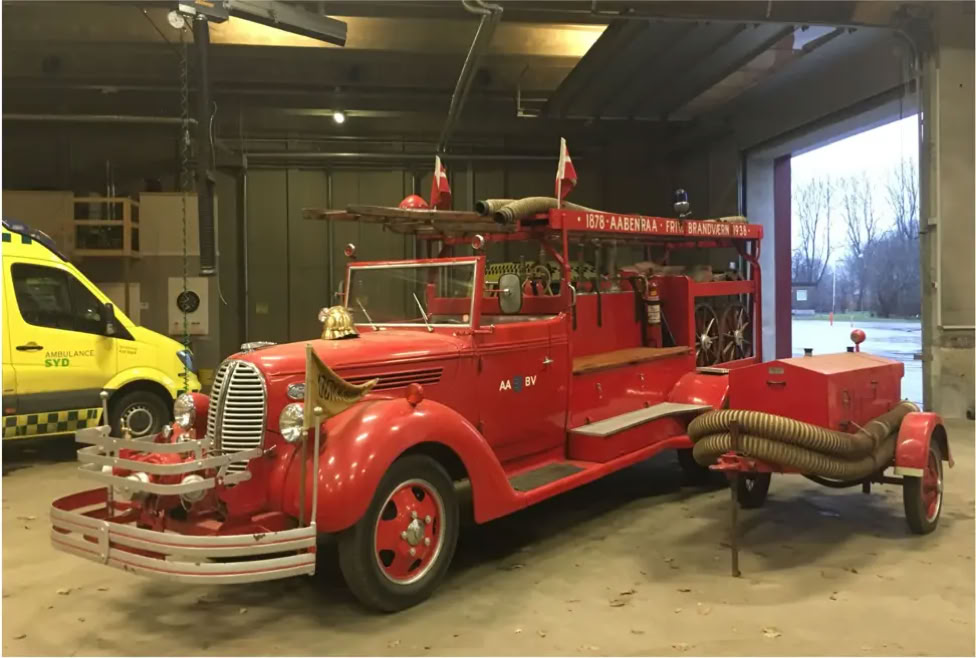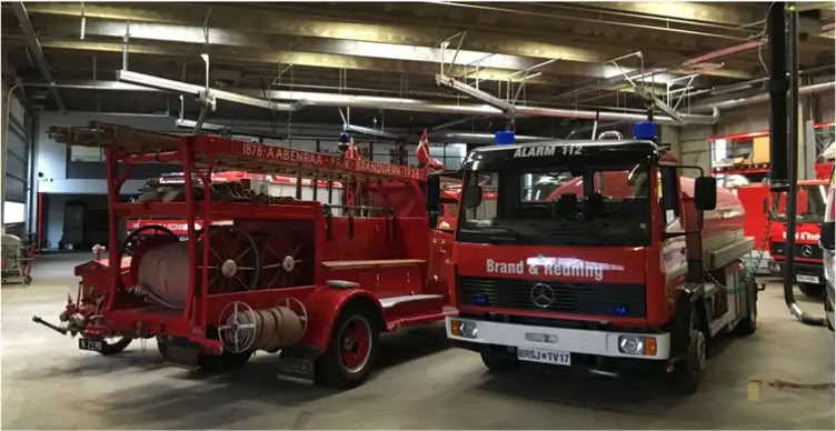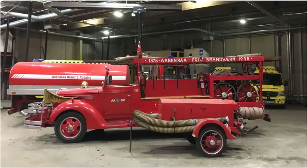 Die Frivillige Brandvær Aabenraaverfügt zwar über eine große Halle, diese hat aber nur drei Tore. Zwei Tore gehören zur Feuerwache, ein Tor zum Rettungsdienst. Deshalb stehen die aktiven, wie auch die historischen, Einsatzfahrzeuge nach einem ausgeklügeltem System.