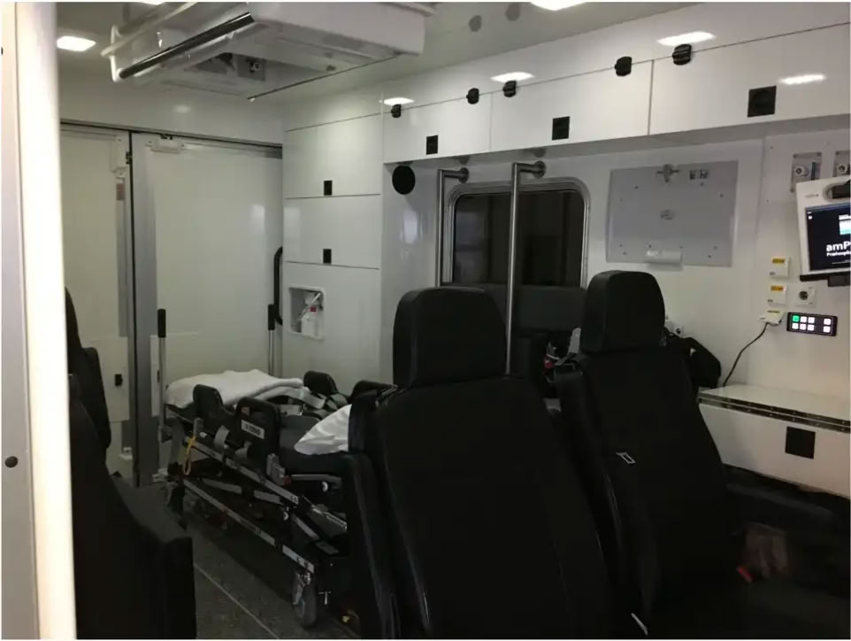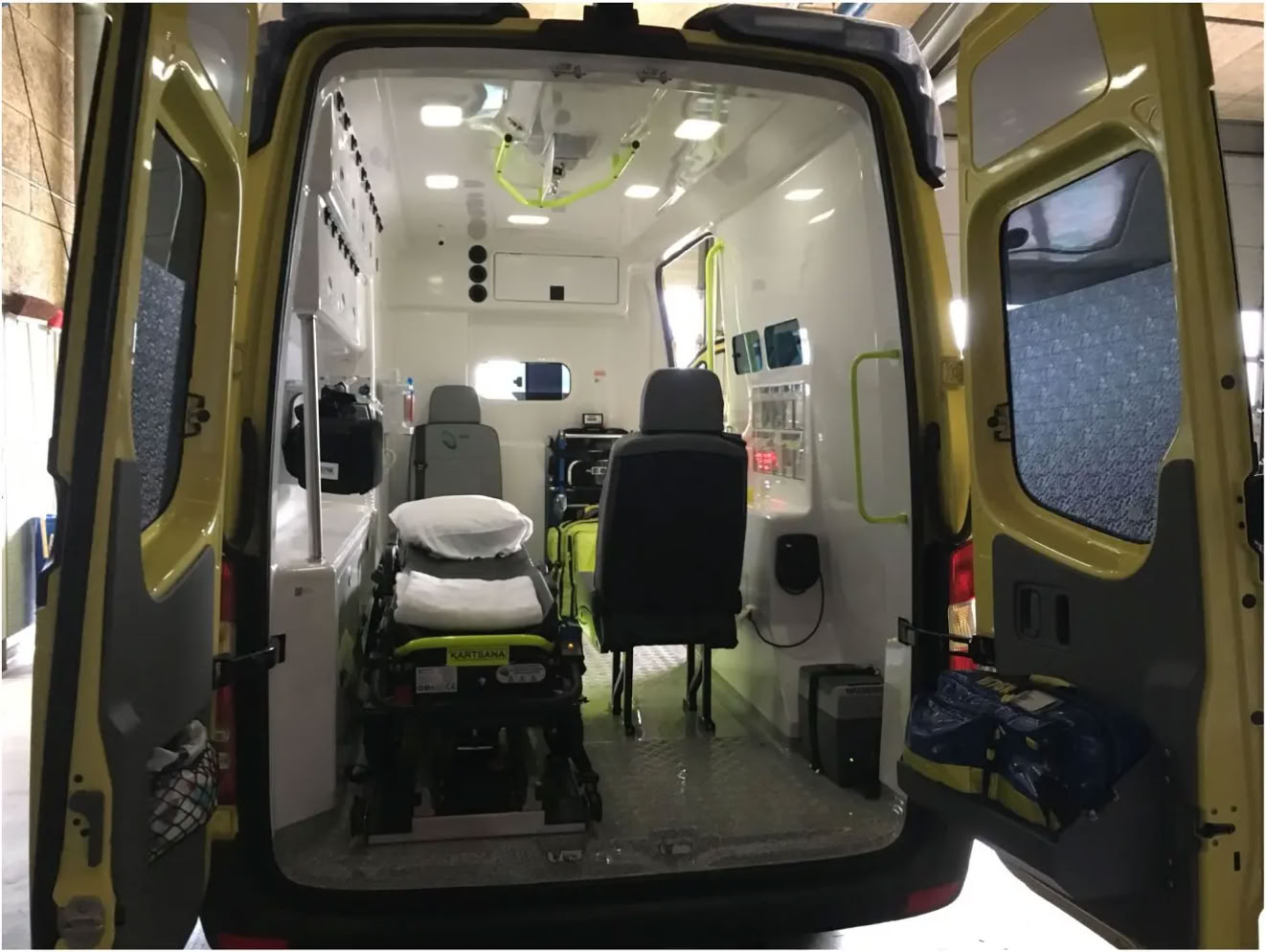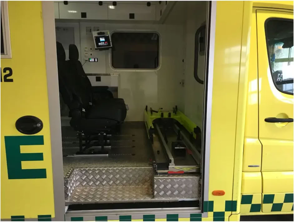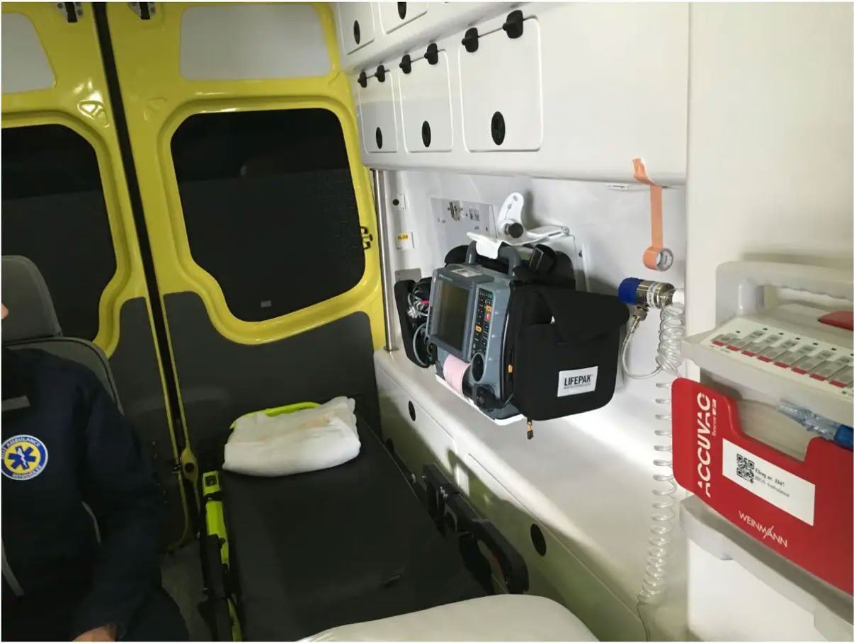 Blick in einen RTW von Ambulance Syd. Alle RTW's in der Region sind Identisch auf Basis eines Mercedes Sprinter aufgebaut. Von Ende 2019 bis 2021 werden diese, nach einer Ausschreibung, durch einen VW Crafterersetzt.