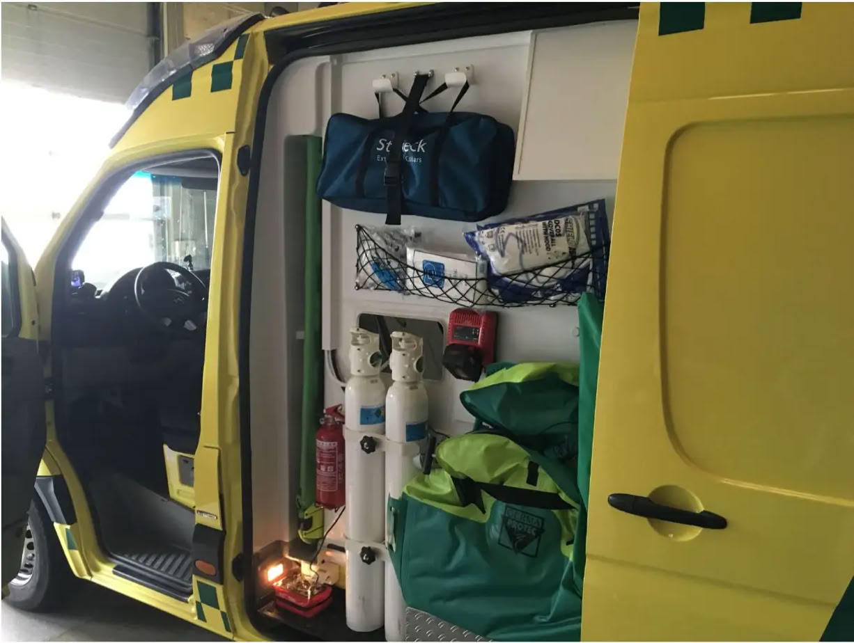 Hinter der linken Schiebetür verbirgt sich Sauerstoff, die Ladehalterung für den Akku des elektrischen Tragestuhls, Materialien für die Traumaversorgung und Leichensäcke. Ja, der Rettungsdienst muss bei erfolglosen Reanimationen, auf Verlangen der Hinterbliebenen, den Leichnam in die nächste Klinik zu transportieren.