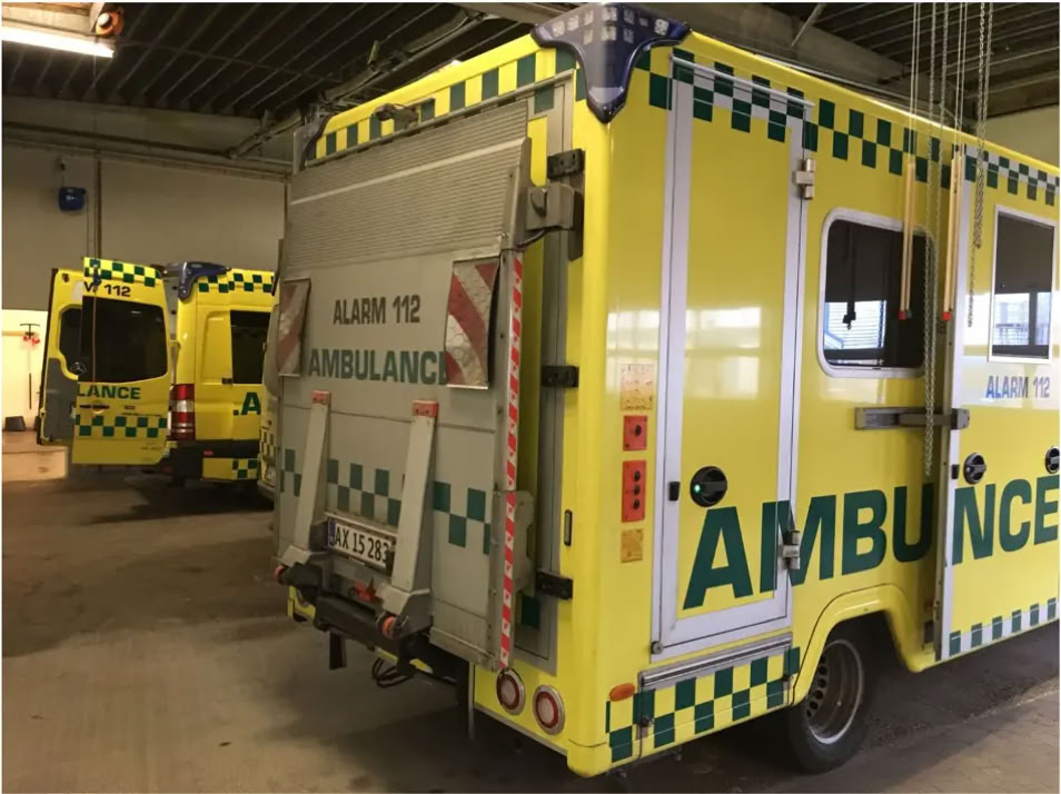 Sonderfahrzeug, in Dänemark RTW XXL genannt. Dies Fahrzeug wird sowohl als Schwerlast - RTW (dafür die Hubbühne am Heck), wie auch als Inkubator - RTW genutzt .