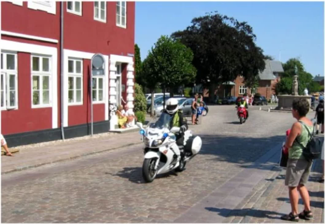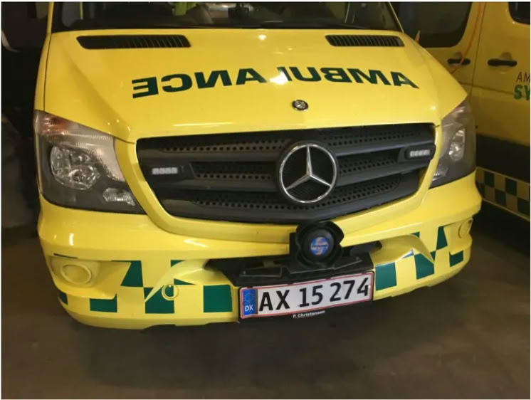 Auch ein Rettungswagen von Falk, begleitet das Radrennen.Falk war bis 2016 ein Monopolist unter den Rettungsdiensten. Nach einer EU weiten Ausschreibung 2015, kam es letztendlich zu einer Verstaatlichung des RD in der Region Südjüland
