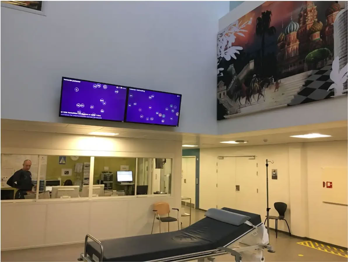 In der Notaufnahme der Uniklinik Odense werden auf zwei Monitoren Kreise in den Farben der Triage mit den Initialen der Patienten angezeigt. Unten rechts die Anzahl aller Patienten in der Wartezeit und die durchschnittliche Wartezeit. Damit kann sich jeder Patient selber ausrechnen, wie lange er noch auf eine Behandlung warten muss.
