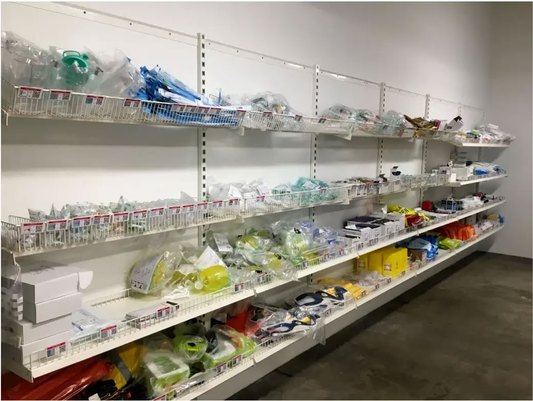Aufgeräumtes und übersichtliches Lager. Die Entnahme wird nicht dokumentiert. Zu jedem Artikel hängen vorne am Regal Kärtchen mit Namen, Foto und QR-Code des jeweiligen Artikels. An einem bestimmten Tag der Woche muss die diensthabende Schicht durchs Lager gehen und bei Bedarf Material nachbestellen. Dies geschieht mit dem Pad von einem RTW, in dem man sich ins Intranet einloggt und dort die Bestellseite aufruft. Dann hält man die Kamera des Pad auf den jeweiligen QR-Code des Artikels. Das Pad erkennt den Artikel und der Besteller muss nur noch die Anzahl eintippen. Hat der Besteller sich einmal durch das ganzen Lager gearbeitet, muss er nur noch den Bestellbutton klicken und das fehlende Material wird zwei Tage später vom Rahmenvertragspartner geliefert.