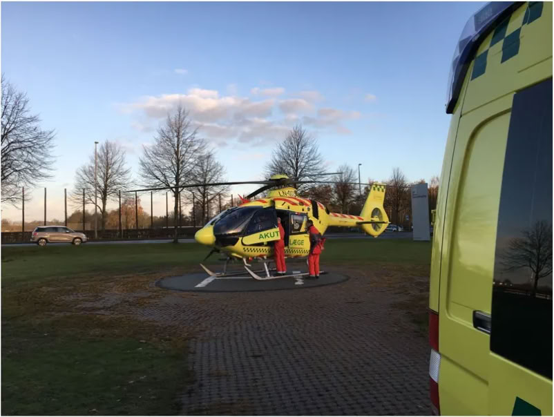 Der Rettungshubschrauber (HEMS) aus Billund. Hier bringt er einen Patienten zur Uniklinik in Odense zum Landeplatz, wo der Patient in einem RTW umgelagert werden muss und zu Aufnahme gefahren wird.