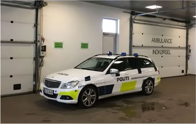 Noch eine dänische Besonderheit: In einigen Fahrzeughallen der Liegendzufahrt der Kliniken, wie hier in Aabenraa, ist ein Platz für die Polizei reserviert. Der Grund dafür ist, dass die Polizei für die Transporte von psychisch Kranken zuständig ist. Außerdem hat sie so einen Platz, wenn sie für gewalttätige Patienten angefordert wird.