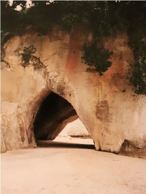 Schaut man durch den Cathedral Cove, einem natürlichen Tunnel, sieht man den diesen Felsen im Meer.