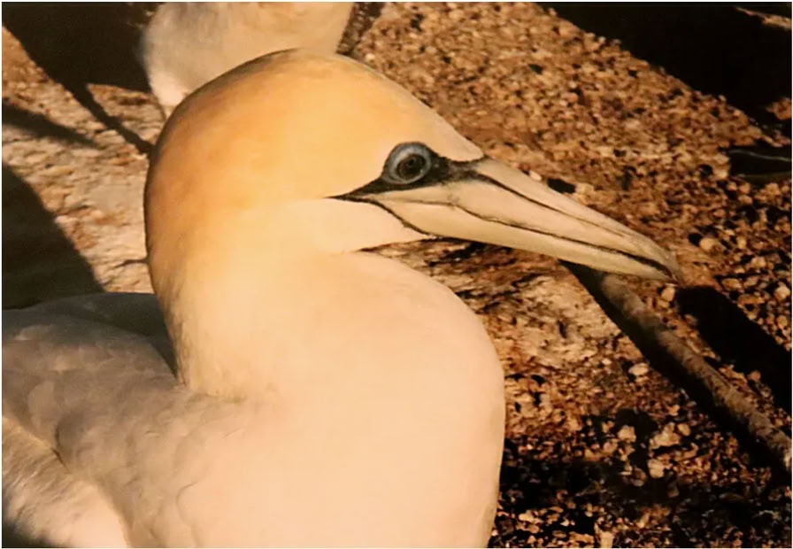 Das Gefieder der jungen Basstölpel ist Gräulich und ändert sich erst nach der ersten Mauser zu dem schicken und typischen Gefieder.