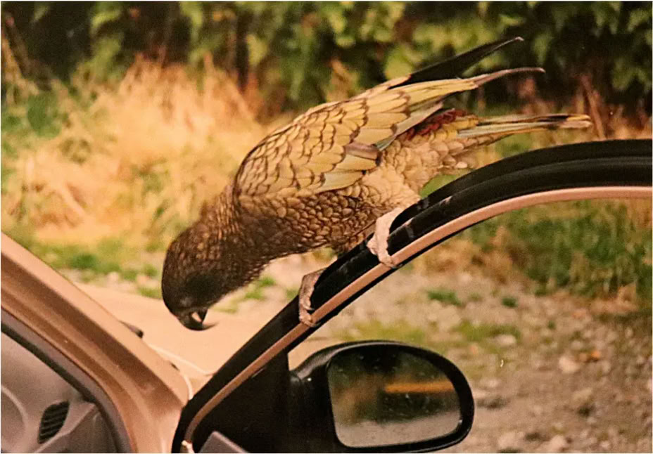 Ein wenig Brot auf dem Beifahrersitz und schon war sein Interesse geweckt. Ich hatte gehofft, dass er sich traut in den Wagen zu klettern. Aber der Kea zauderte mit sich selbst und zerstörte schließlich aus Frust das Türgummi.