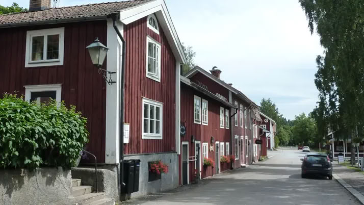 Die Laxbrogatan in Kopparberg. Viel Holz und dem sehenswertenMiljömuseum.