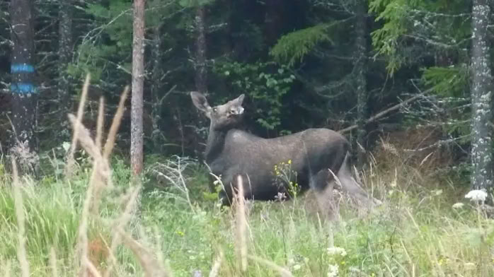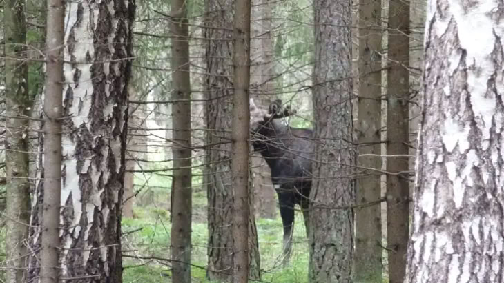Kaum das ich 5 min. im angrenzenden Wald spazieren war, da scheuchte ich einen Elch auf, der etwa 20 m neben dem Weg geruht hatte. Eigentlich war ich schon an ihm vorbei, ohne den Elch gesehen zu haben. Wäre er liegen geblieben hätte ich ihn aufgrund seiner guten Tarnung übersehen. Nun sprang der Elch aber auf und rannte sofort etliche Meter in den Wald hinein, bevor er stehen blieb, um mich zu begutachten. Ich konnte also nur noch ein Bild mit Elch und Bäumen knipsen.