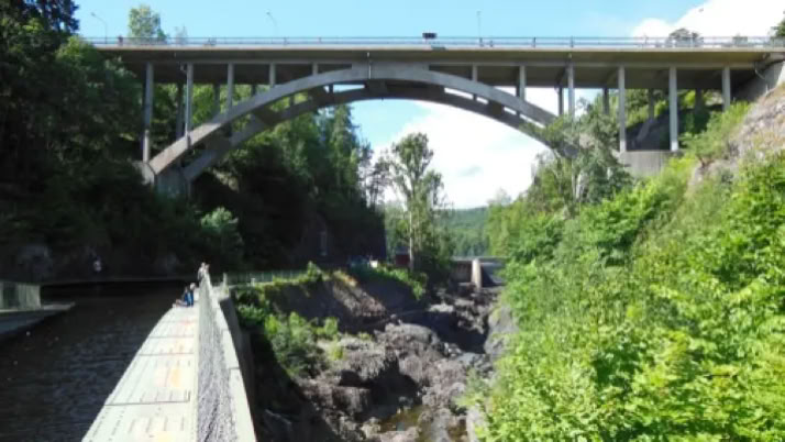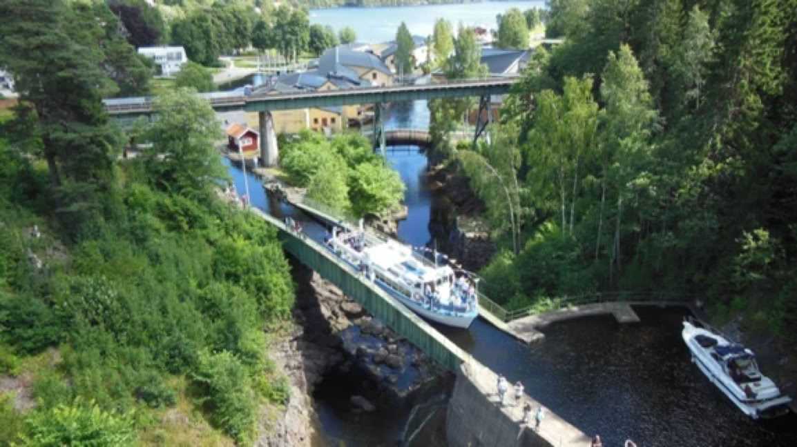 Genug gestaunt, wir fuhren weiter nachHåverud, wo derDalsland-Kanalmehrere Schleusen durchquert. Die größte Sehenswürdigkeit ist aber dasAquädukt, der den alten Flusslauf überbrückt und dabei selbst von einer Eisenbahnbrücke und einer Strassenbrücke überbrückt wird.