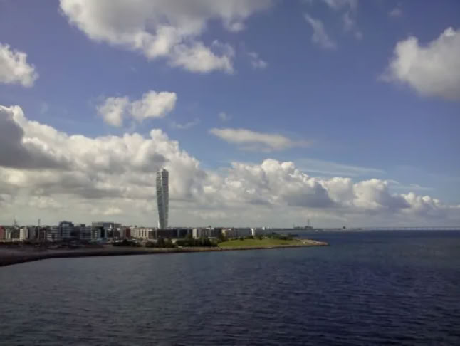 Schon weit vor der Einfahrt in den Hafen von Malmö kann man das Wahrzeichen der Stadt sehen, denTurning-Torso.